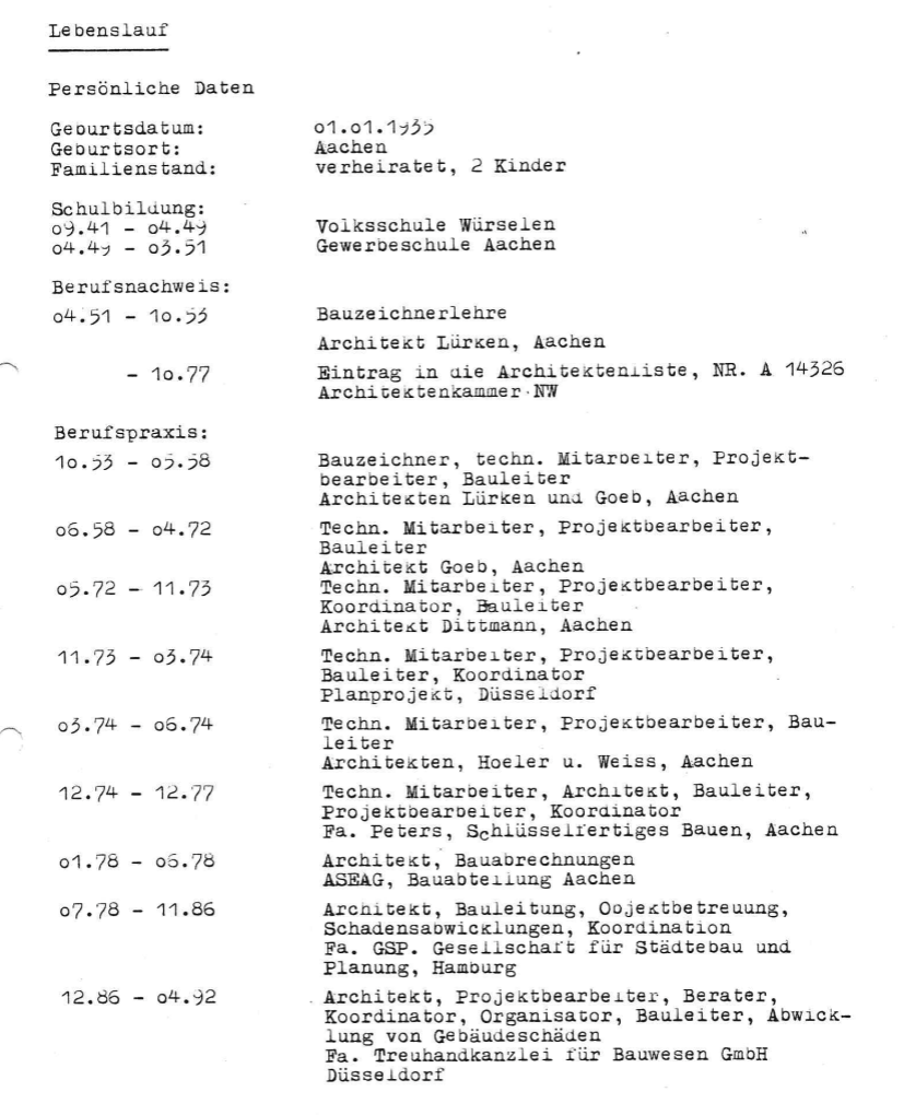· Worked as draughtsman, technical assistant, project assistant, coordinator, site manager and architect in Aachen and Düsseldorf (1953–1992+)